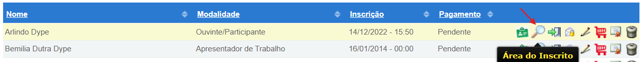 • Ao localizar o inscrito, clique no ícone de lupa na lateral direita do nome para acessar a área do inscrito.