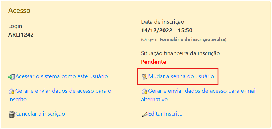 • Após a alteração, envie manualmente o novo login e a senha ao inscrito/associado por e-mail, fora do sistema.