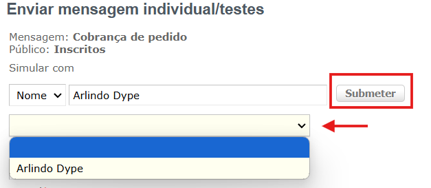 2. Na página seguinte, no campo Simular com digite o nome de um inscrito/associado e clique no botão Submeter. Logo abaixo clique no campo e selecione o inscrito que foi pesquisado.